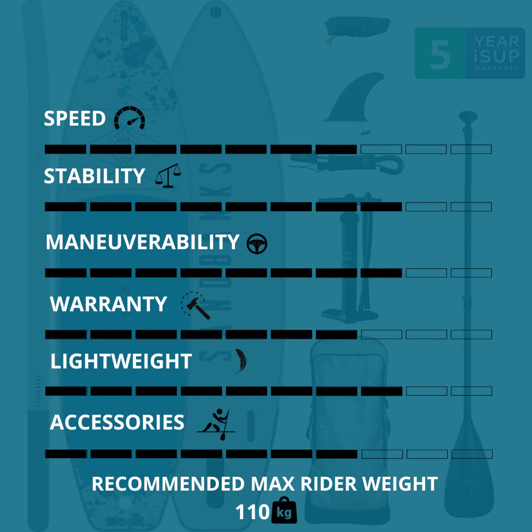 Ultimate Blue 10'6'' x 32'' x 4.75'' iSUP Package Built on over a decade of paddleboard expertise, this versatile board delivers stability and smooth gliding for beginners and experienced paddlers alike. The 32'' width and refined shape keep you balanced across seas, rivers, lakes and canals. Double-skinned fusion construction with drop-stitch core provides exceptional durability and rigidity in a lightweight design. Supports riders up to 110 kg. Includes pump, three-piece aluminium paddle, ankle leash, padded rucksack, fins and 5-year warranty. Everything you need to start paddling today.